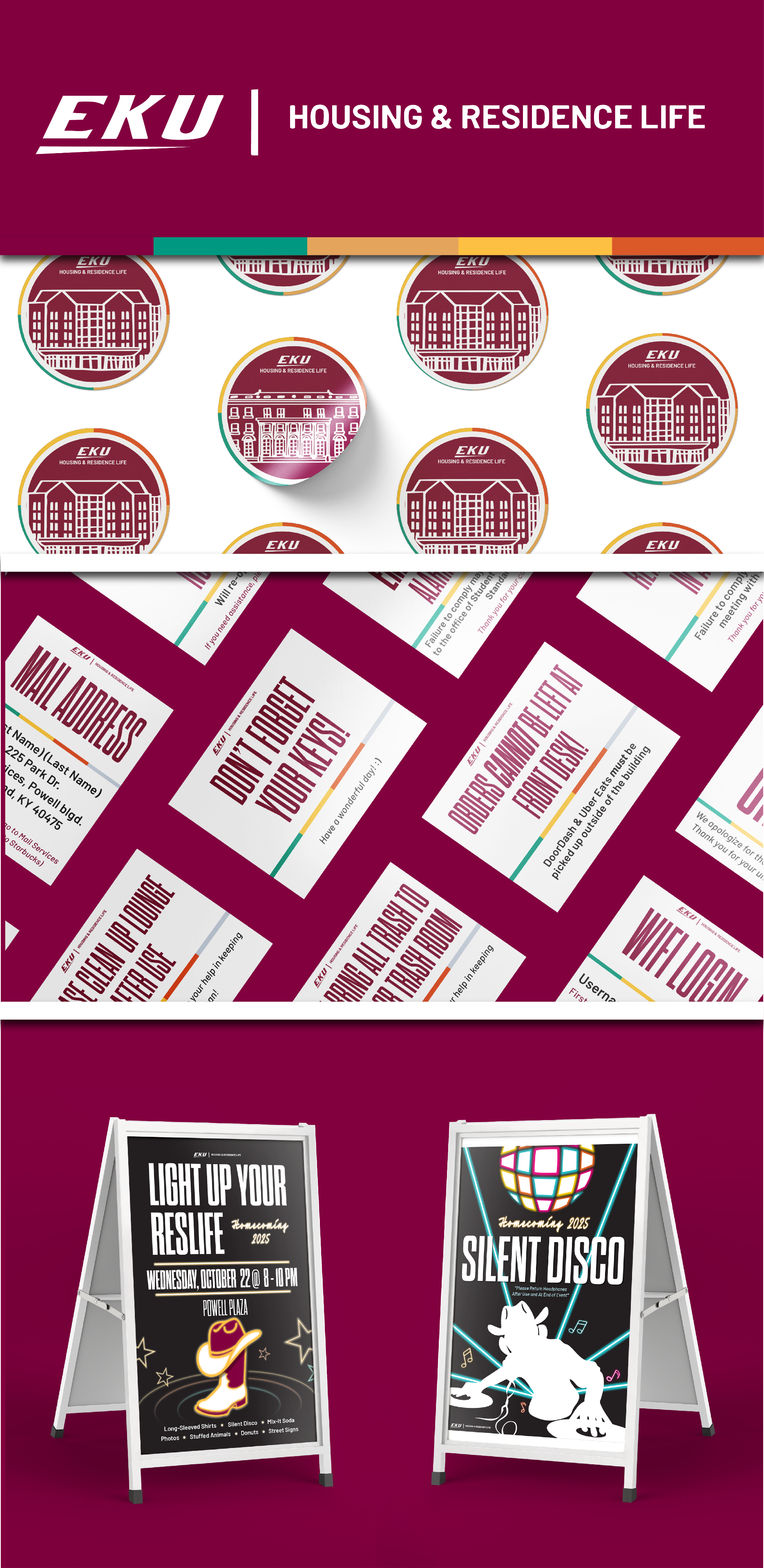 Marketing and advertising work for EKU Housing and Residence Life, including social media posts, flyers, posters, event work, and more.